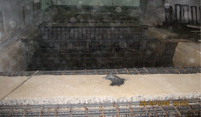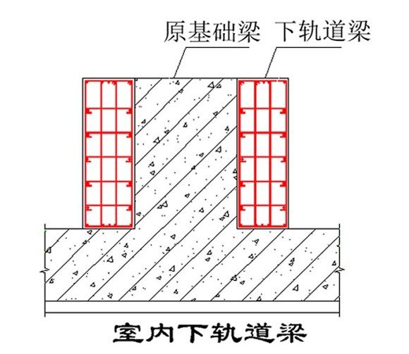 該建筑物的原基礎(chǔ)是筏板基礎(chǔ),平移時利用原有的基礎(chǔ),將縱向基礎(chǔ)梁兩側(cè)加寬,既是對原基礎(chǔ)進行加固,又可控制新舊基礎(chǔ)的沉降差。