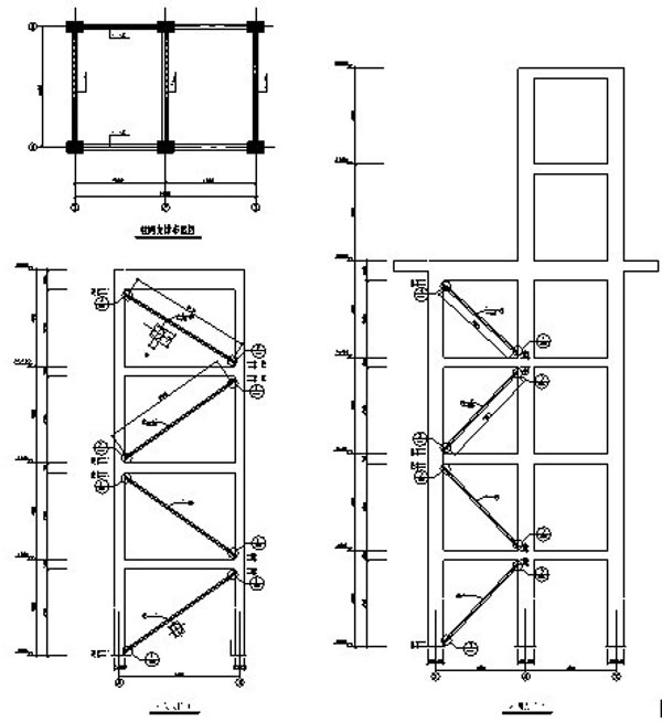 魯西化工廠銅洗框架,4層(局部6層)框架,頂部擱置一液體儲箱。使用過程中在風(fēng)的作用下液面晃動(dòng),使結(jié)構(gòu)出現(xiàn)較大幅度振動(dòng),頂層有明顯振感。采取增加耗能鋼支撐的方法增強(qiáng)結(jié)構(gòu)剛度,減輕振動(dòng)效應(yīng)。