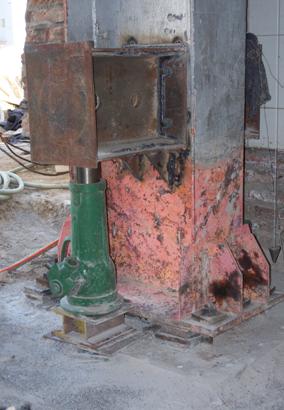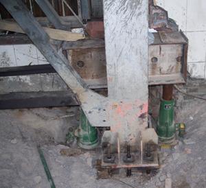 由于礦井凍結(jié)法施工造成后期井口附房產(chǎn)生較大沉降,影響了上部結(jié)構(gòu)的使用。采用頂升法對鋼結(jié)構(gòu)廠房中的沉降較大的鋼柱進(jìn)行糾偏,該方面需要在鋼柱腹板上焊接鋼牛腿提供頂升支點(diǎn),同時(shí)對鋼柱底部預(yù)埋的螺栓桿體加長,每個(gè)鋼柱兩側(cè)設(shè)置兩個(gè)頂升千斤頂,經(jīng)過頂升糾偏后該鋼結(jié)構(gòu)廠房基本恢復(fù)原狀。