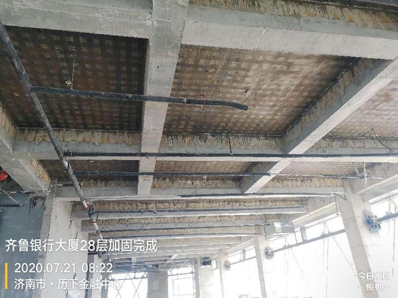 本工程為齊魯銀行大廈加固改造工程,位于濟南市歷下區(qū)歷下金融中心B座。本工程為典型的寫字樓因使用功能的改變而進行的加固改造工程,齊魯銀行接受建筑后,進行了從負三層機房至屋頂花園的全面加固改造,主要加固部位為地下柴發(fā)機房、UPS電池室、三層控制機房、各層衛(wèi)生間和層間機房、健身房、檔案室、廚房、屋頂花園等,主要加固方式為梁增大截面、新增混凝土梁、梁板粘貼碳纖維。工程難點在于大量大宗材料(鋼筋、模板、灌漿料)需倒運至各樓層,弱電安裝已完成,施工面不足。